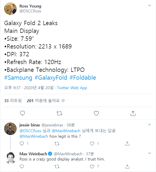 루머) 갤럭시 폴드2 디스플레이 스펙 유출 (120Hz,펀치홀,UTG,S펜지원)